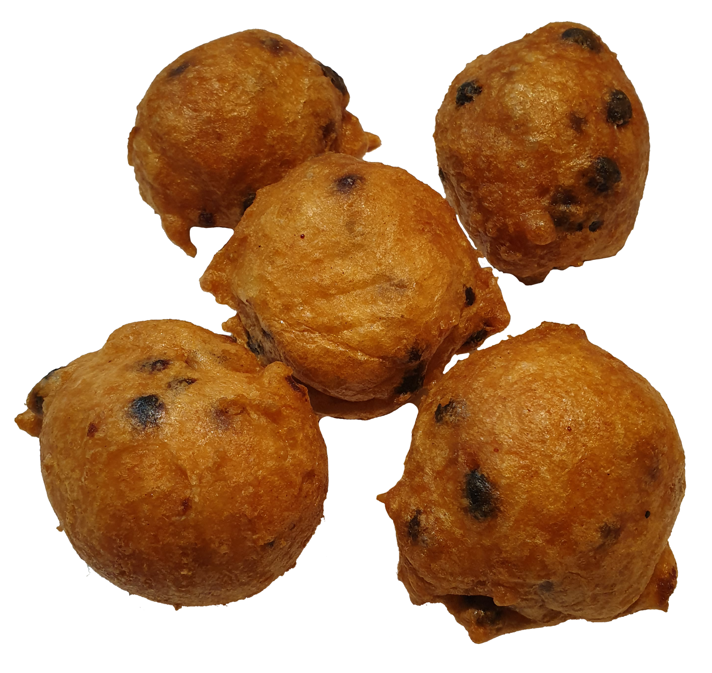 Deze glutenvrije oliebollen zijn gevuld met rozijnen en stukjes appel.